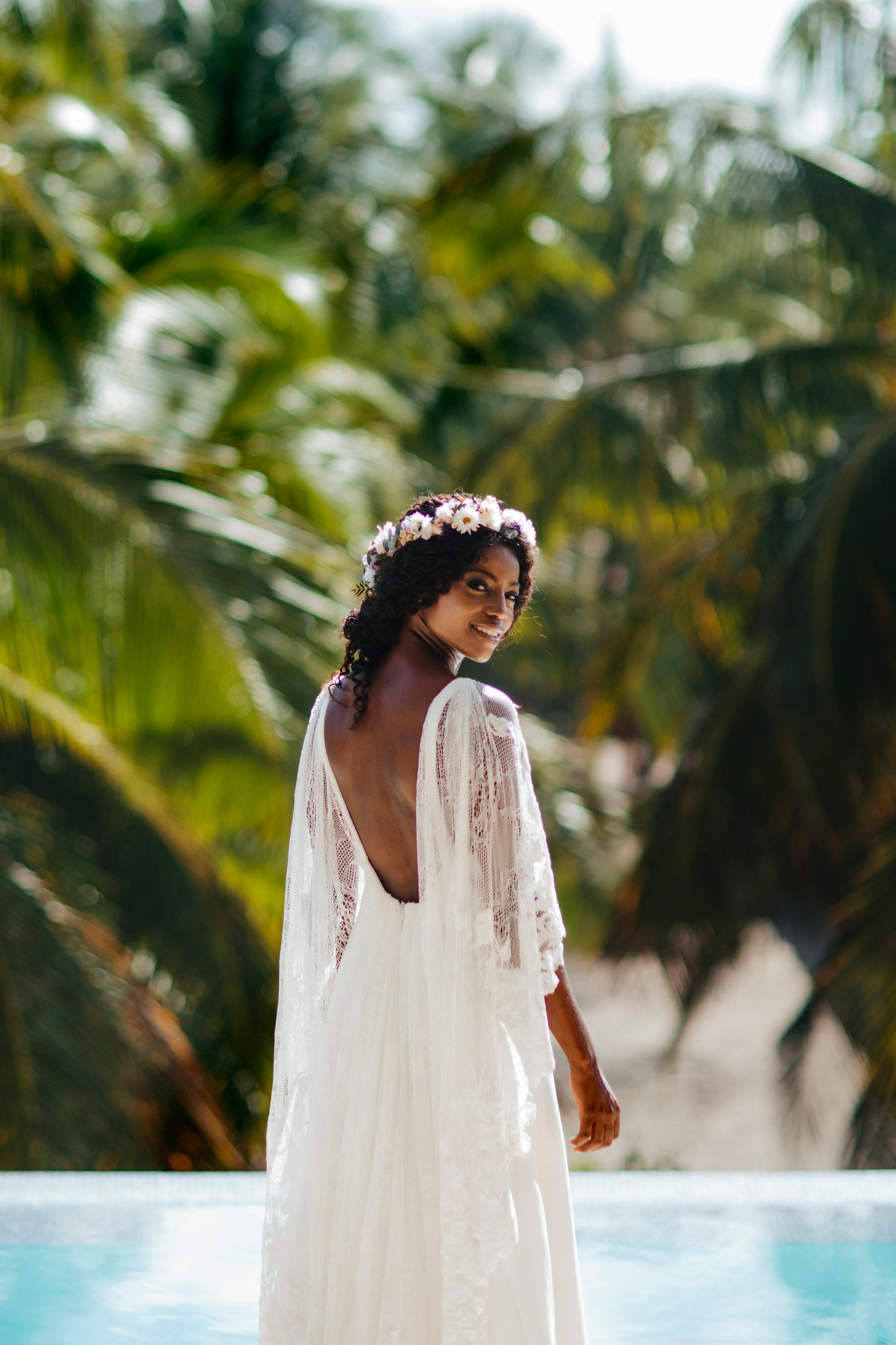 An ethereal flower crown and white dresses will give a boho feel. The lush accessory is especially for summer weddings.
